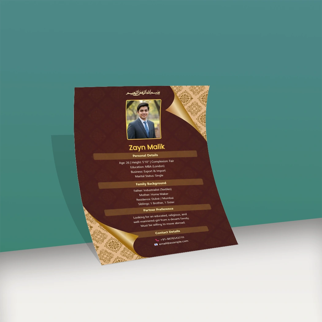 Rich brown background with intricate gold motifs. Ideal for a traditional marriage biodata.